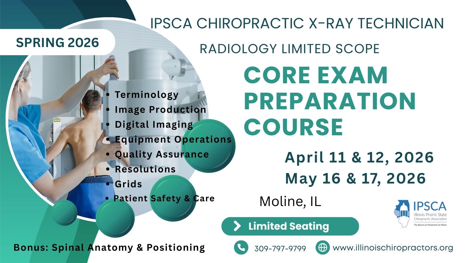The Illinois Prairie State Chiropractic Association (IPSCA) presents a 32 hour prep course for the Illinois/ARRT state exam which will allow your CA to take spinal x-rays. REQUIRED BY STATE LAW: Anyone in a chiropractic office taking x-rays is REQUIRED to be licensed or certified by the state of Illinois and the ARRT. Under the Illinois Radiation Act, a licensed Chiropractor may register an assistant (CA) as a “Student-In-Training” in radiology. Within 8 months of state application registration the student must take and pass a CORE exam given by the ARRT in radiation physics and patient protection followed by an examination in a specialty position selected (spinal). Upon successful completion of the examination the student will be certified to take x-rays by the Illinois Department of Nuclear Safety and the ARRT as a “Limited Radiographic Technician”.